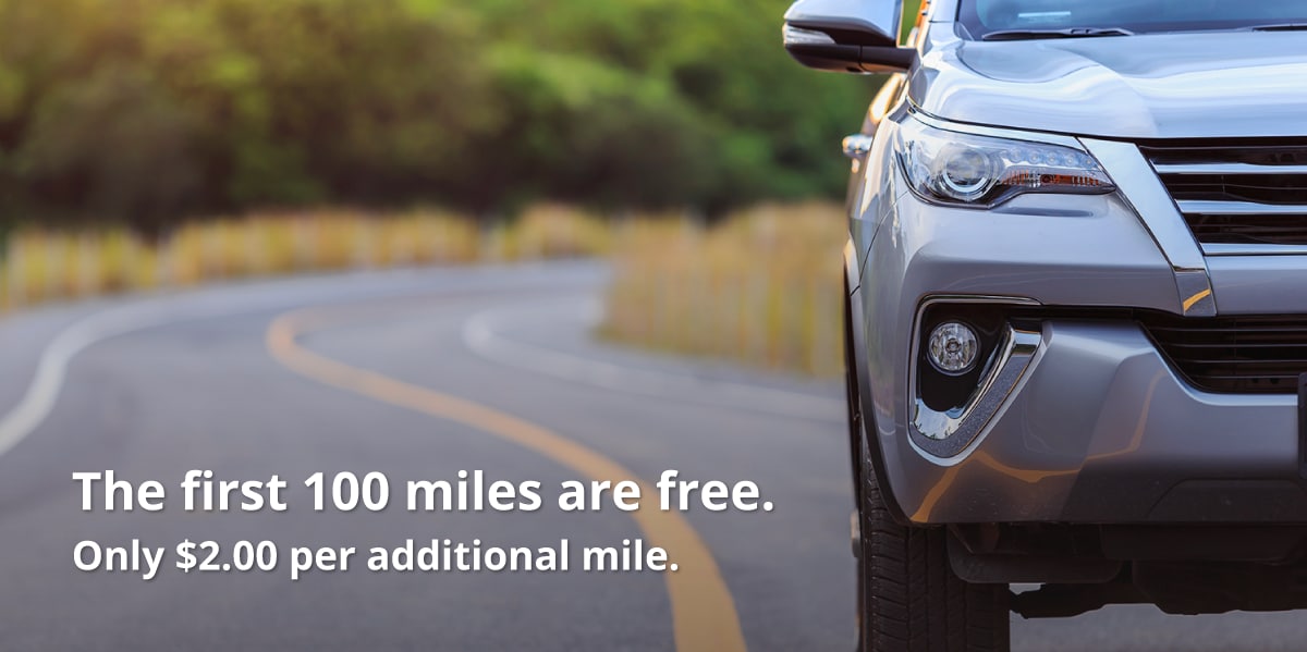 First 100 miles are free and additional $2.00/ mile after that.
